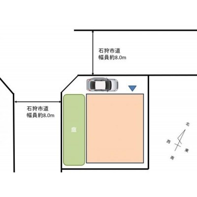 【敷地図】現状駐車一台です。お庭スペースを駐車場スペースとし