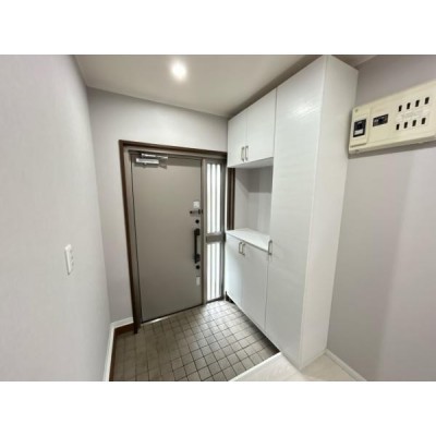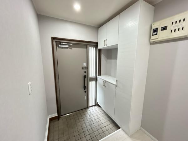 【現況 玄関】白とグレーの内装で清潔感があります。