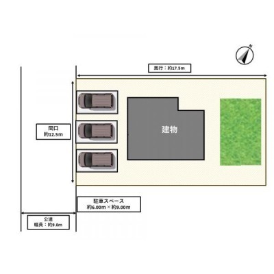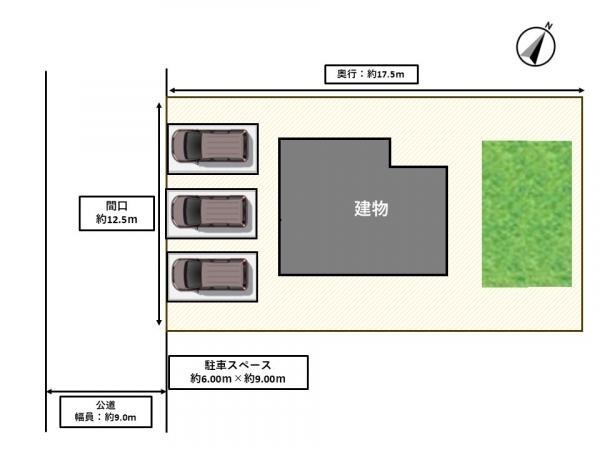 【現況 敷地図】敷地前面には3台分の駐車スペースがあります。