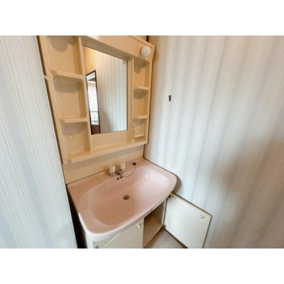 【現況 洗面台】洗面化粧台の写真です。収納スペースがあり、タ