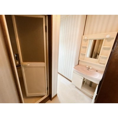 【現況 洗面脱衣所】脱衣場の写真です。トイレと別空間のため、