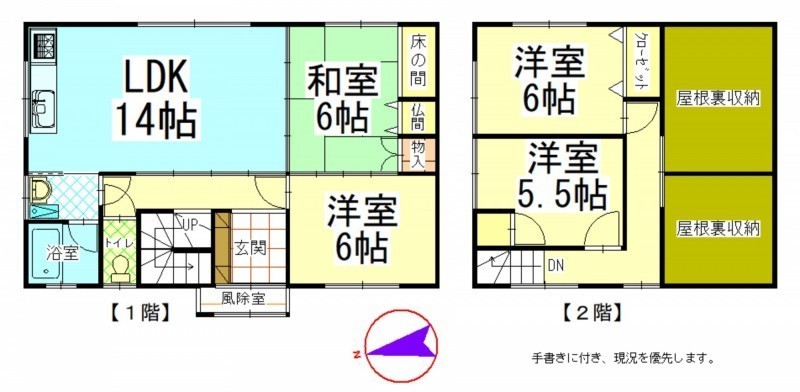 | 間取り | 4LDK1階:LDK14帖 洋室6帖 和室6帖 / 2階:洋室6帖 洋室5.5帖 |