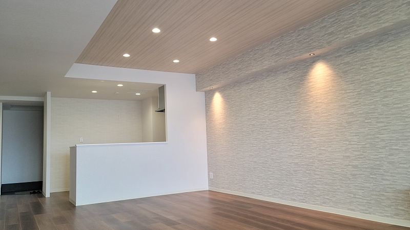 ダウンライト、間接照明、アクセントクロスを駆使したお洒落なデザインのリビングです