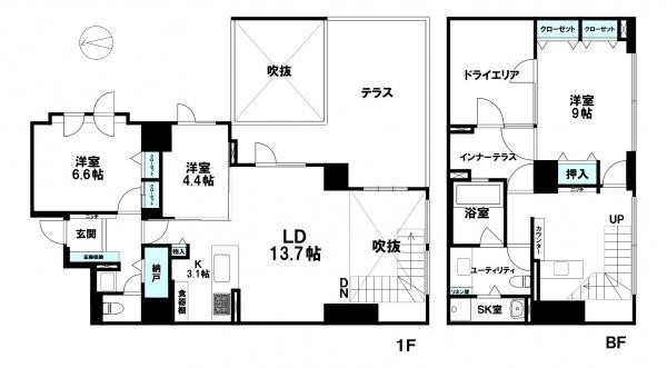 備考 テラス、インナーテラス、ドライエリア、バーカウンターがあり戸建て感覚でお住まいいただける札幌市内では数少ないメゾネット物件です。地下鉄駅が近く、近隣施設も充実しています。是非お問合せ下さい。・東向き 学区色がついているアイコンをクリックすると、本物件までの道順を見ることができます。