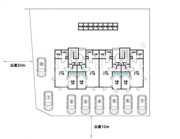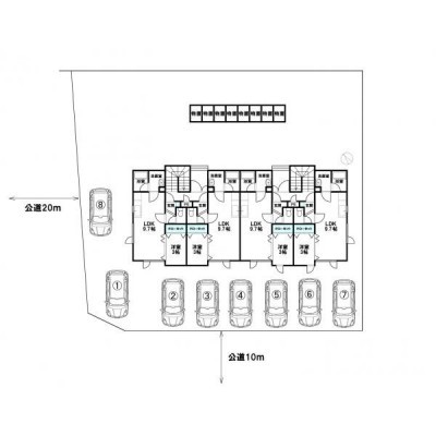 建物の階建 地上2階建 間取り 1LDK 駐車場 あり 駐車場台数:8台接道状況 二方(除角地) - 北西側幅8.00mの公道に22.00m接道