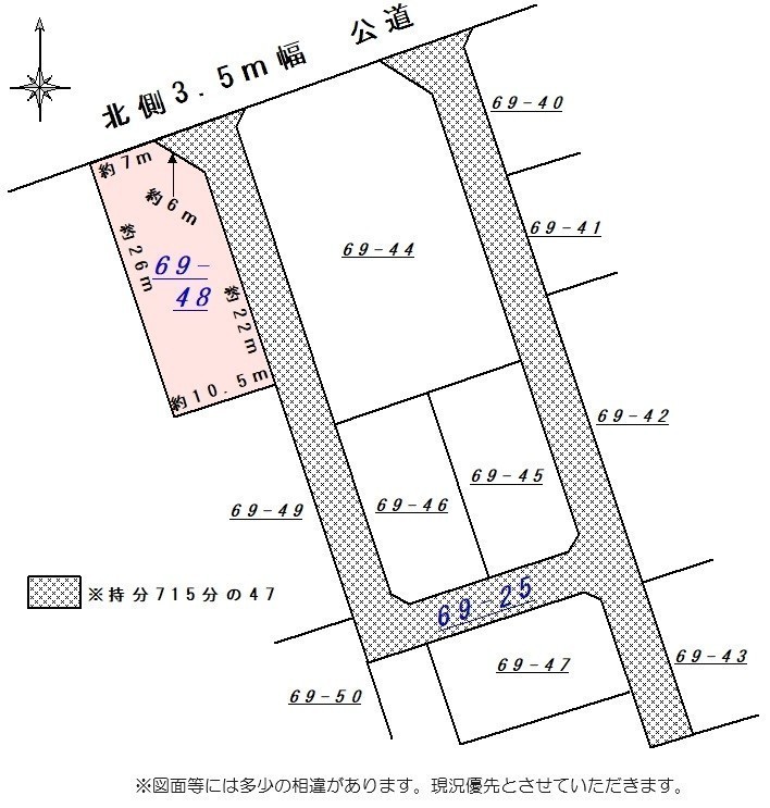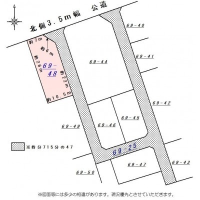備考 ※69番48の外に69番25あり:原野(通路)/715㎡/持分715分の47 学区色がついているアイコンをクリックすると、本物件までの道順を見ることができます。