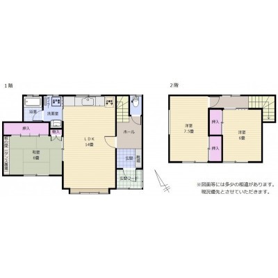 | 間取り | 3LDK1階:和室6帖 LDK14帖 / 2階:洋室7.5帖 洋室6帖 |