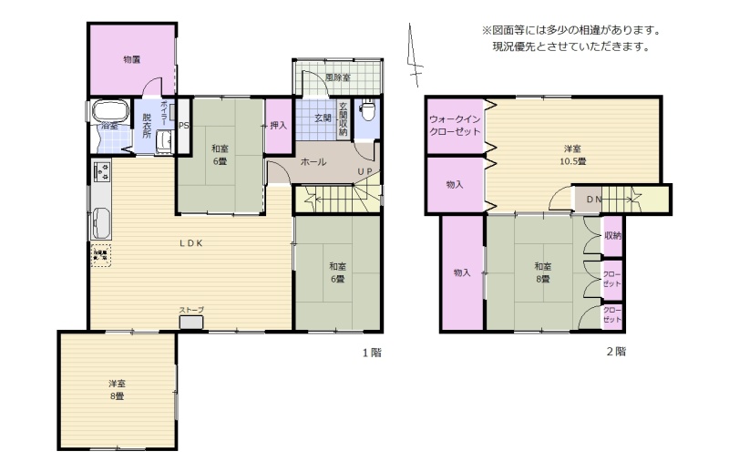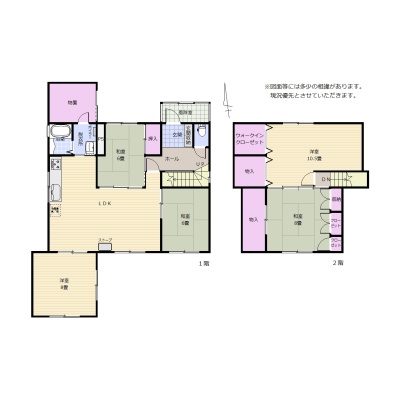 建物の階建 地上2階建 構造 その他(コンクリートブロック・木造) 間取り 5LDK1階:LDK 和室6帖 洋室8帖 和室6帖 / 2階:洋室10.5帖 和室8帖 駐車場 接道状況 角地 - 北側幅6.00mの公道に11.00m接道