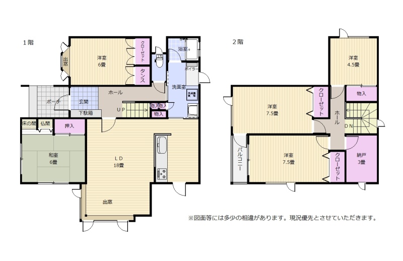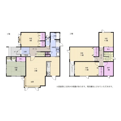 | 間取り | 5LDK1階:洋室6帖 和室6帖 / 2階:洋室4.5帖 洋室7.5帖 洋室7.5帖 その他3帖 / その他:LDK18帖 |