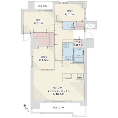 3LDK(75.81m²)└ LDK16.6帖 洋室4.3帖 洋室6.1帖 洋室5.1帖