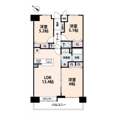 3LDK(64.92m²)└ 4階:LDK13.4帖 洋室6帖 洋室5.2帖 洋室5.1帖
