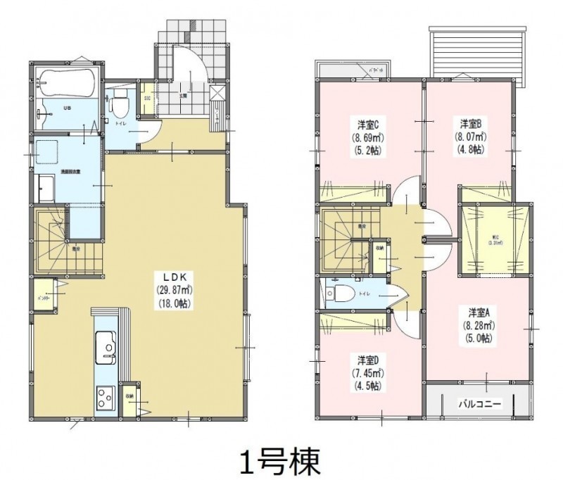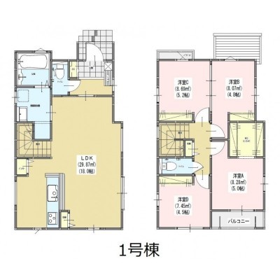 | 間取り | 4LDK1階:LDK18帖 / 2階:洋室5.2帖 洋室5帖 洋室4.8帖 洋室4.5帖 |