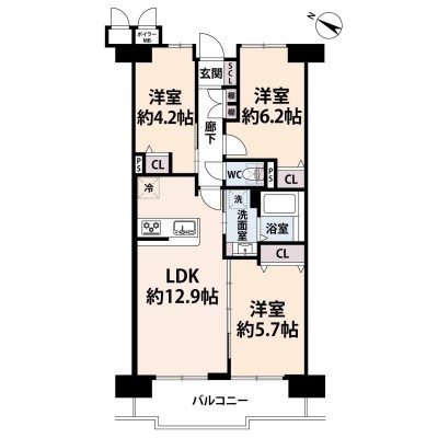 3LDK(62.48m²)└ 5階:LDK12.9帖 洋室6.2帖 洋室5.7帖 洋室4.2帖