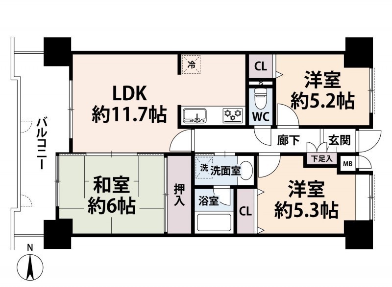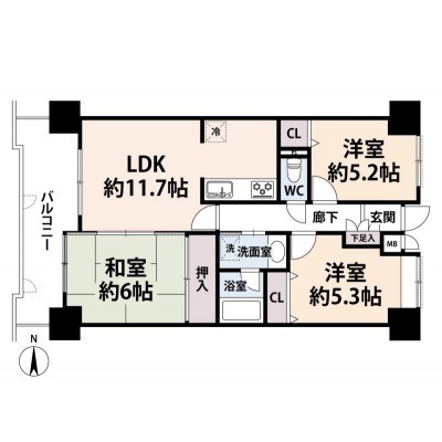 3LDK(64.08m²)└ 10階:LDK11.7帖 和室6帖 洋室5.3帖 洋室5.2帖
