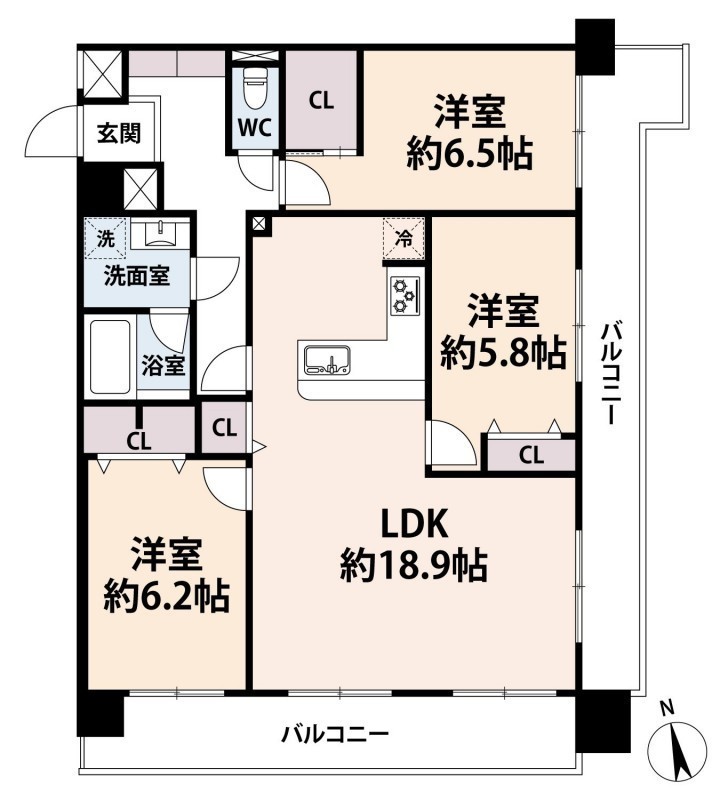 3LDK(82.82m²)└ 9階:LDK18.9帖 洋室6.5帖 洋室6.2帖 洋室5.8帖