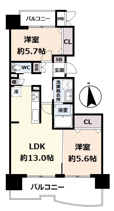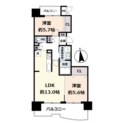 2LDK(58.72m²)└ 6階:LDK13帖 洋室5.7帖 洋室5.6帖
