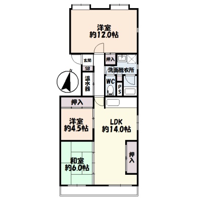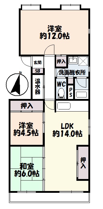3LDK(84.77m²)└ 1階:LDK14帖 和室6帖 洋室4.5帖 洋室12帖
