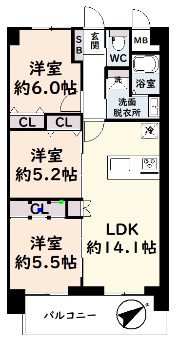 3LDK(68.04m²)└ 6階:LDK14.1帖 洋室6帖 洋室5.5帖 洋室5.2帖