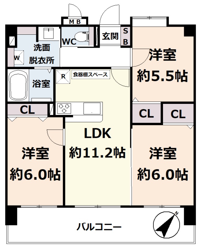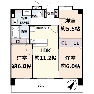 3LDK(63.1m²)└ 5階:LDK11.2帖 洋室6帖 洋室6帖 / 6階:洋室5.5帖