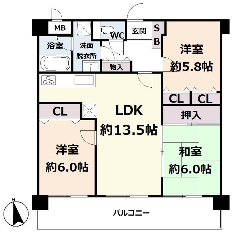 3LDK(69.54m²)└ 3階:LDK13.5帖 和室6帖 洋室6帖 洋室5.8帖
