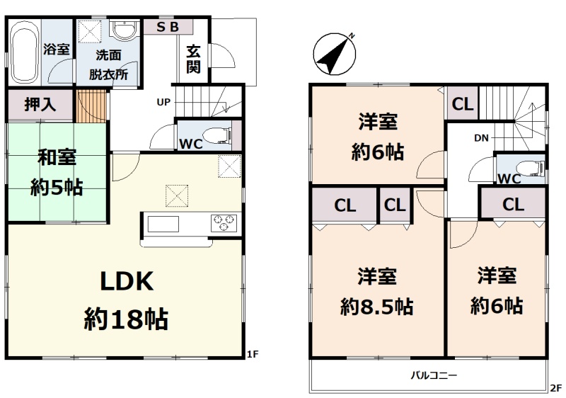 | 間取り | 4LDK1階:LDK18帖 和室5帖 / 2階:洋室8.5帖 洋室6帖 洋室6帖 |