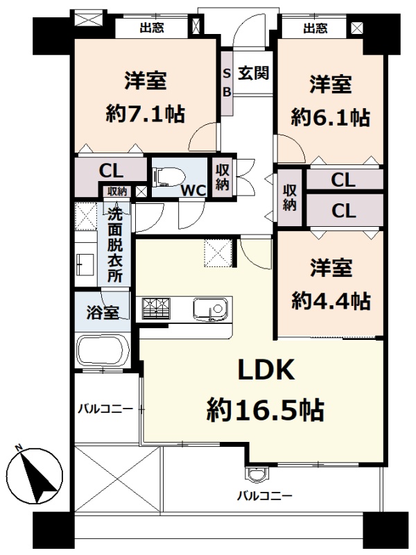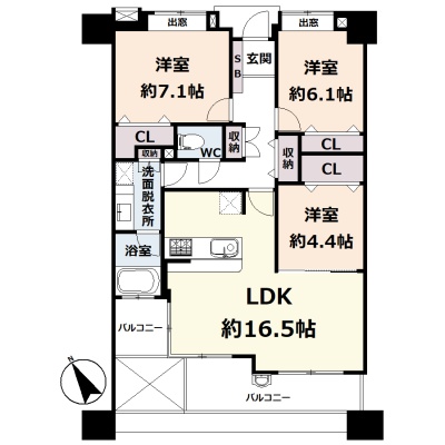 3LDK(79.2m²)└ 5階:LDK16.5帖 洋室7.1帖 洋室6.1帖 洋室4.4帖
