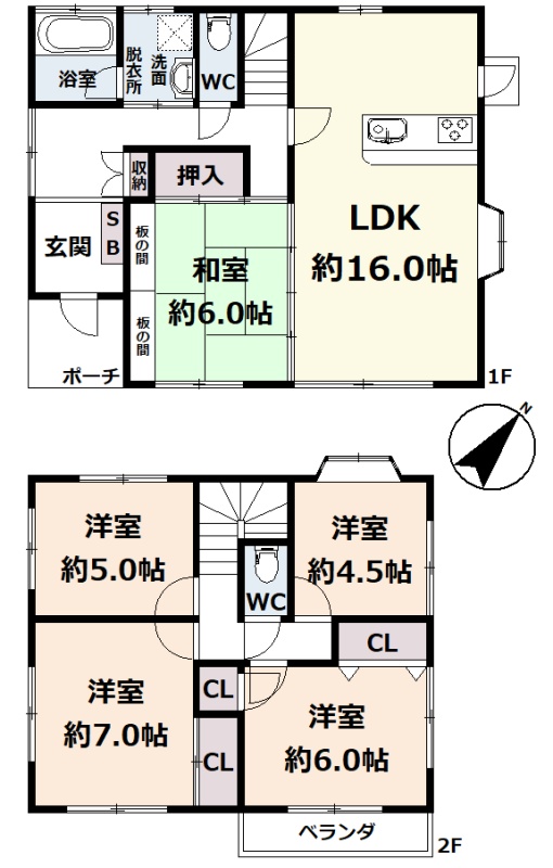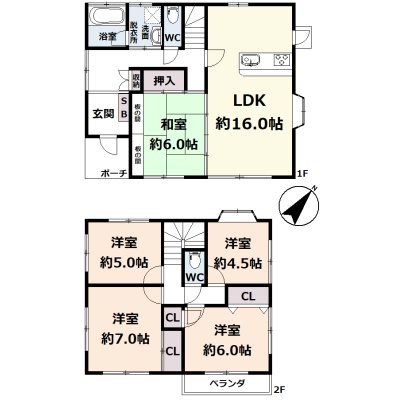 | 間取り | 5LDK1階:LDK16帖 和室6帖 / 2階:洋室7帖 洋室6帖 洋室5帖 洋室4.5帖 |