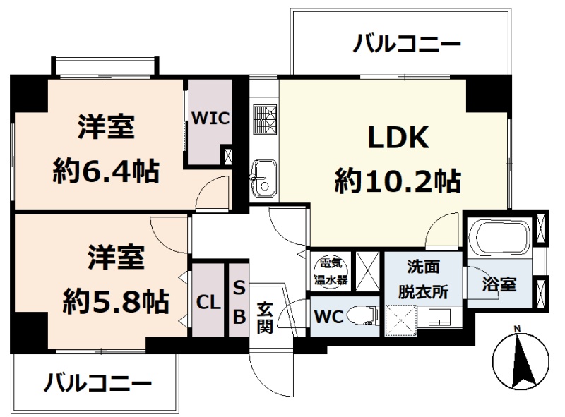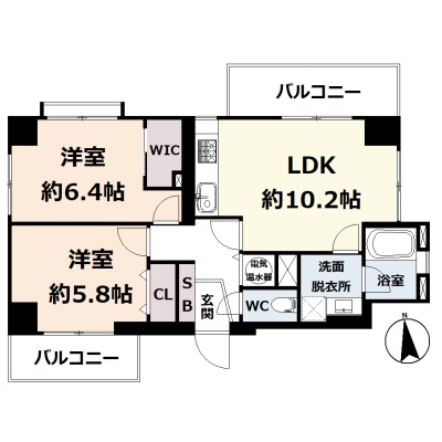 2LDK(54.33m²)└ 5階:LDK10.2帖 洋室6.4帖 洋室5.8帖
