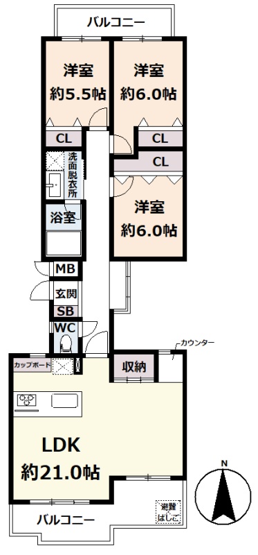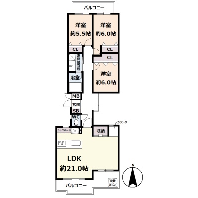 3LDK(84.64m²)└ 3階:LDK21帖 洋室6帖 洋室6帖 洋室5.5帖