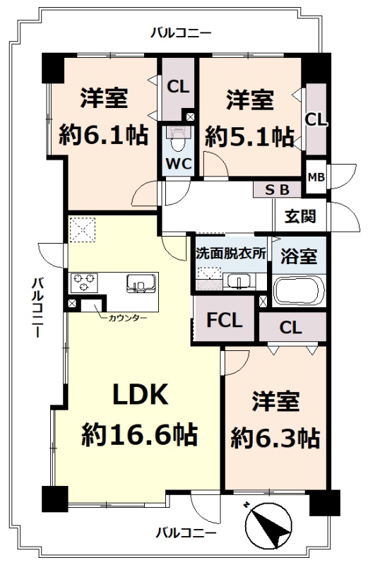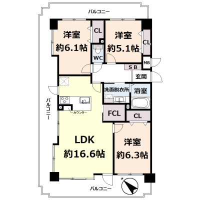 3LDK(76.93m²)└ 5階:LDK16.6帖 洋室6.3帖 洋室6.1帖 洋室5.1帖
