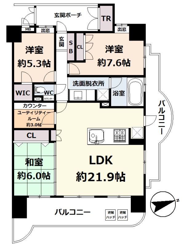 3SLDK(93.09m²)└ 8階:LDK21.9帖 和室6帖 洋室7.6帖 洋室5.3帖 S3帖