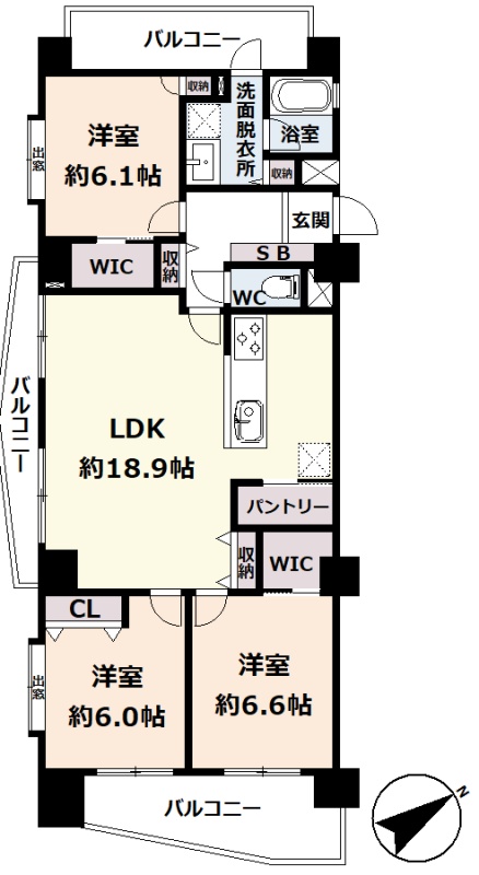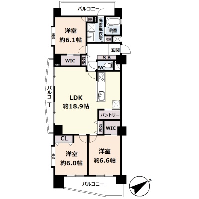 3LDK(84.71m²)└ 8階:LDK18.9帖 洋室6.6帖 洋室6.1帖 洋室6帖