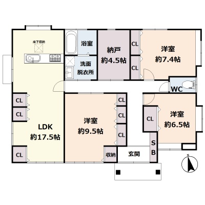 | 間取り | 3SLDK1階:LDK17.5帖 洋室9.5帖 洋室7.4帖 洋室6.5帖 S4.5帖 |