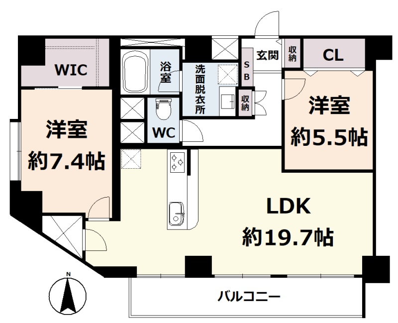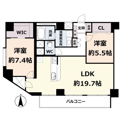 2LDK(79.5m²)└ 6階:LDK19.7帖 洋室7.4帖 洋室5.5帖