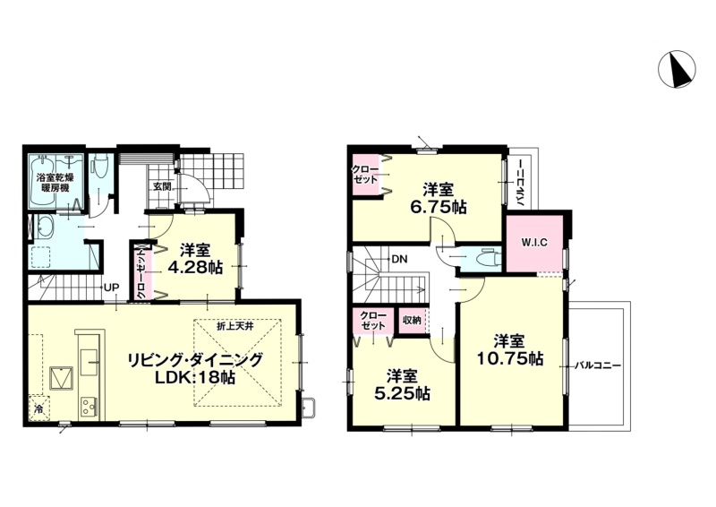 | 間取り | 4LDK1階:LDK18帖 洋室4.8帖 / 2階:洋室10.75帖 洋室6.75帖 洋室5.25帖 |