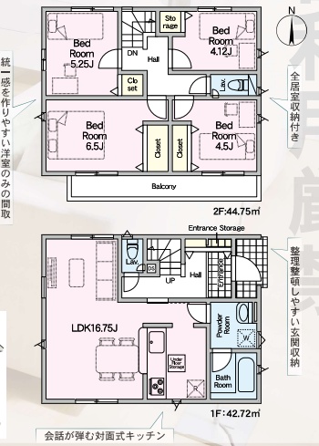 | 間取り | 4LDK1階:LDK16.75帖 / 2階:洋室6.5帖 洋室5.25帖 洋室4.5帖 洋室4.12帖 |