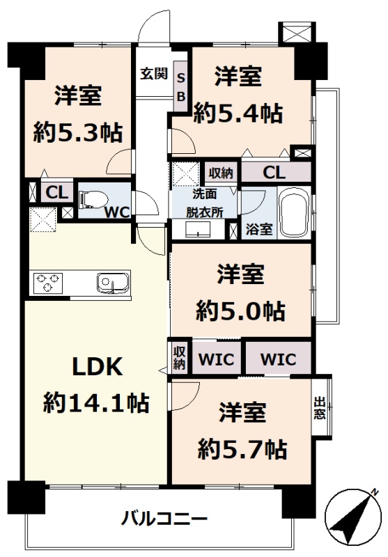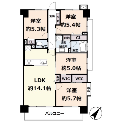 4LDK(75.6m²)└ 4階:LDK14.1帖 洋室5.7帖 洋室5.4帖 洋室5.3帖 洋室5帖