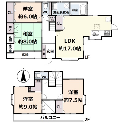 | 間取り | 4LDK1階:LDK17帖 和室8帖 洋室6帖 / 2階:洋室9帖 洋室7.5帖 |