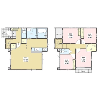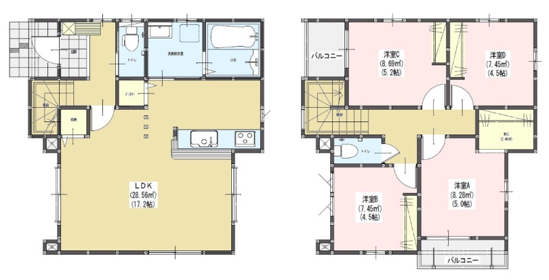 | 間取り | 4LDK1階:LDK17.2帖 / 2階:洋室5.2帖 洋室5帖 洋室4.5帖 洋室4.5帖 |