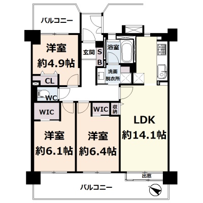 3LDK(71.54m²)└ 6階:LDK14.1帖 洋室6.4帖 洋室6.1帖 洋室4.9帖