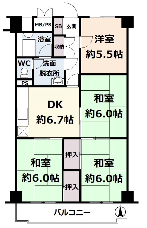 4DK(66.15m²)└ 5階:DK6.7帖 和室6帖 和室6帖 和室6帖 洋室5.5帖