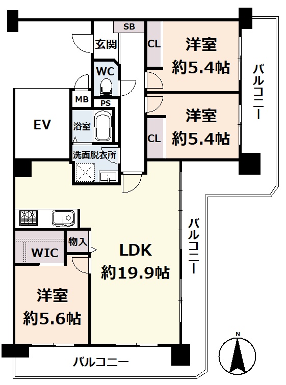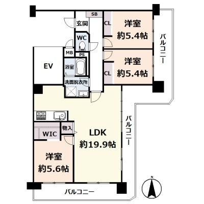 3LDK(79.97m²)└ 6階:LDK19.9帖 洋室5.6帖 洋室5.4帖 洋室5.4帖