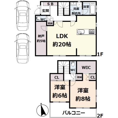 | 間取り | 2SLDK1階:LDK20帖 S5帖 / 2階:洋室8帖 洋室6帖 |