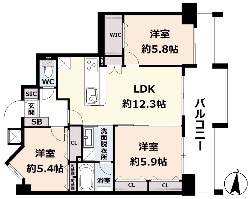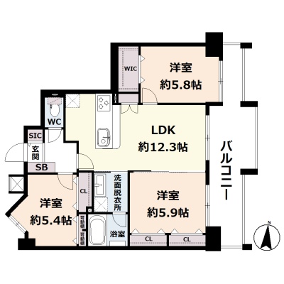 3LDK(66.63m²)└ 6階:LDK12.3帖 洋室5.9帖 洋室5.8帖 洋室5.4帖