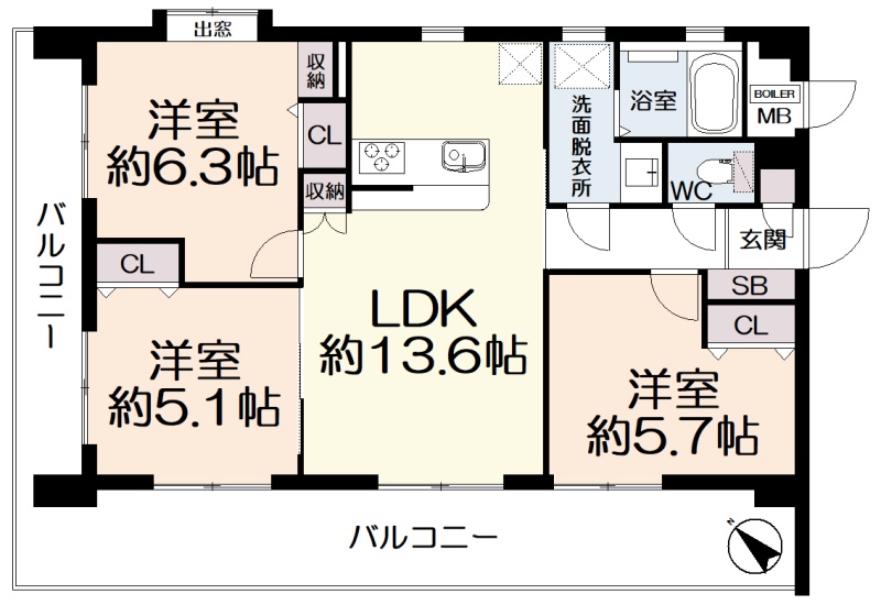 3LDK(66.95m²)└ 2階:LDK13.6帖 洋室6.3帖 洋室5.7帖 洋室5.1帖