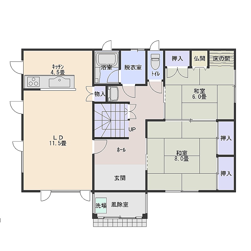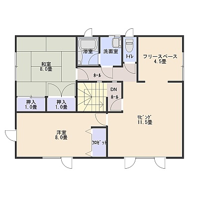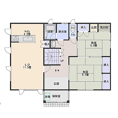 | 間取り | 二世帯型1階:LDK16帖 和室8帖 和室6帖 / 2階:LD12.5帖 洋室6.5帖 和室8帖 |