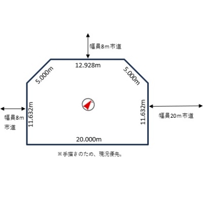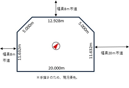 総区画数-/- 接道状況 三方 - 北東側幅20.00mの公道に11.63m接道