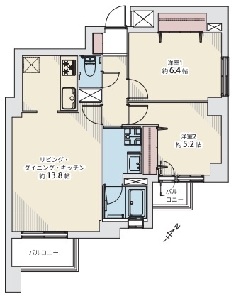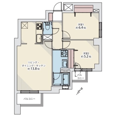 2LDK(57.36m²)└ LDK13.8帖 洋室6.4帖 洋室5.2帖