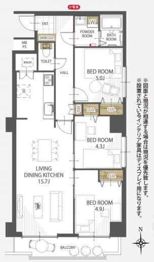 3LDK(69.42m²)└ 洋室5帖 洋室4.9帖 洋室4.3帖 LDK15.7帖