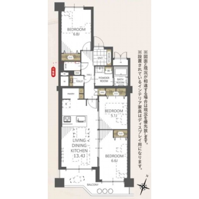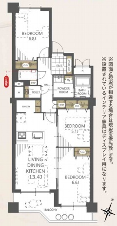 3LDK(74.84m²)└ 洋室6.8帖 洋室6.6帖 洋室5.1帖 LDK13.4帖